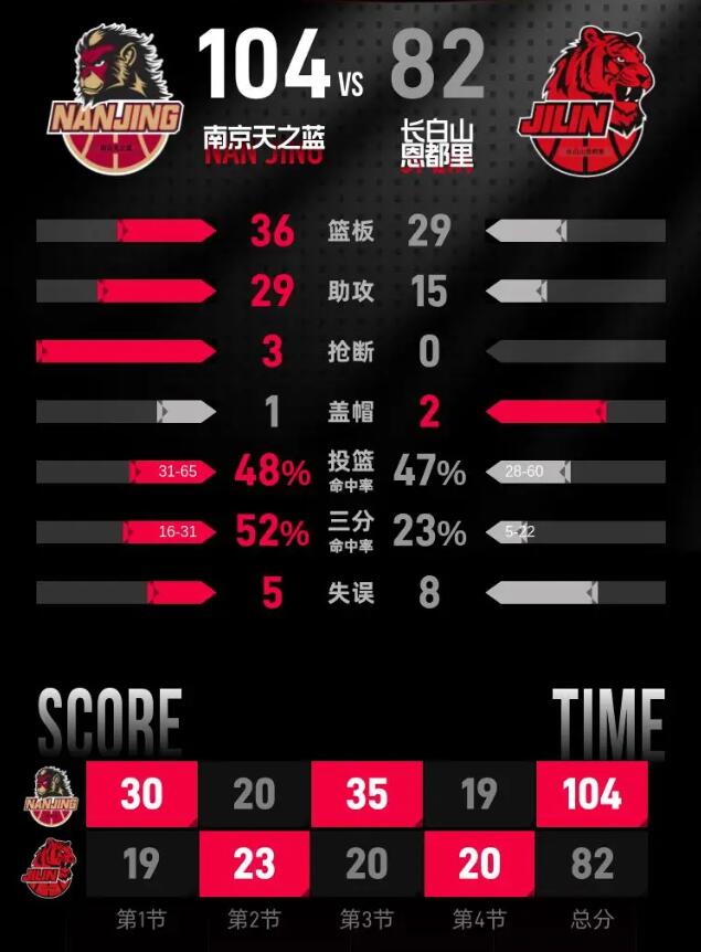 南京天之蓝队:郭昊文22分4篮板7助攻、布雷迪·马内克20分5篮板5助攻、祝铭震16分2篮板1助攻、姜贺13分4篮板6助攻、赵柏清12分5篮板1助攻、马鑫鑫8分3篮板1助攻、李斌卓4分1助攻、黄荣奇4分1篮板1助攻、邬挺嘉3分、理查德·所罗门2分5篮板5助攻、孙鸣阳2篮板1助攻、刘奕杭1篮板。