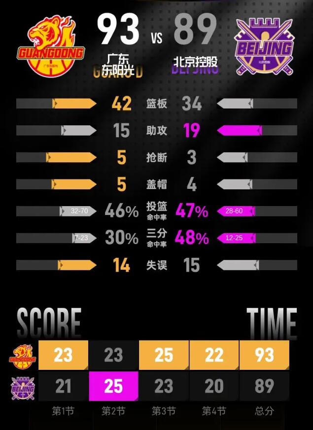 第四节,比赛重新展开,北京控股努力缩小分差,成功将比分追至71-71。然而,广东东阳光随即展开反击,迅速将优势扩大到10分。随着比赛的推进,北京控股在小节后段重新调整状态,逐步将比分拉近。最终,广东东阳光以93-89赢得比赛。
