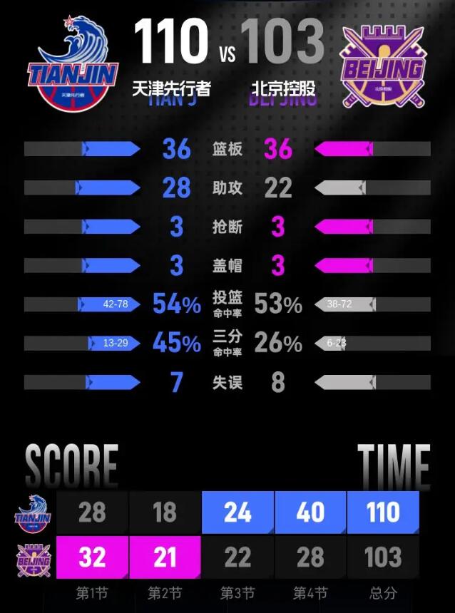 进入第四节,天津先行者的表现初显起伏,分差一度扩大至7分。随着比赛的推进,天津先行者找回了状态,奋起直追,不仅追平了比分,还成功反超7分。在比赛的紧张氛围中,北京控股试图缩小分差。然而,天津先行者的林庭谦在最后时刻砍下11分,其中包括一记关键三分,最终以110-103赢得比赛。