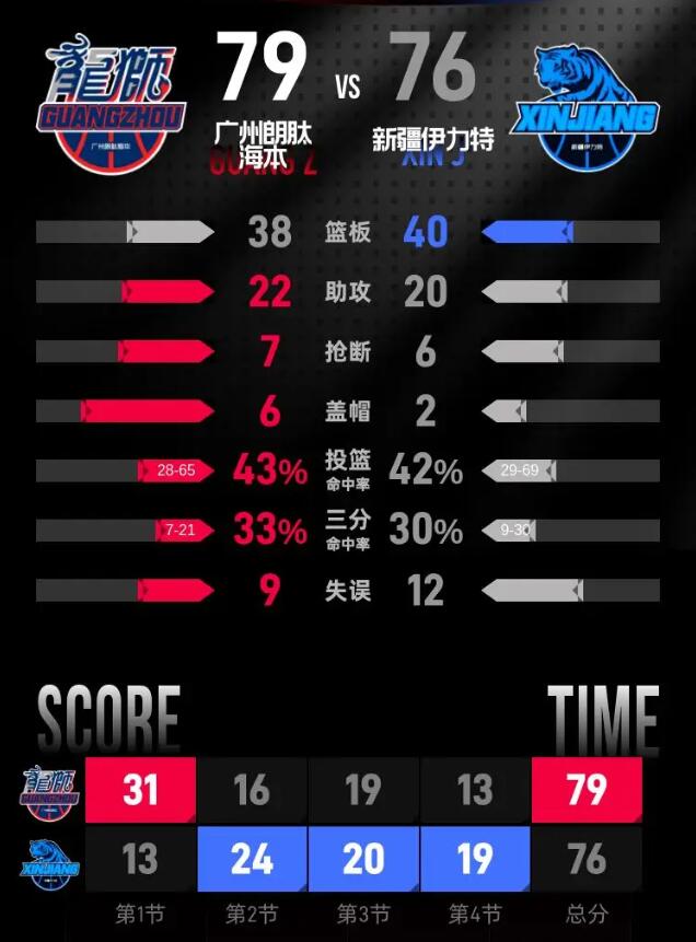 第四节,比赛进入最后决胜阶段,两队继续在场上展开激烈对抗。广州朗肽海本在关键时刻保持冷静,威金顿两罚全中奠定胜局,最终广州以79-76赢下比赛,成功锁定胜局。