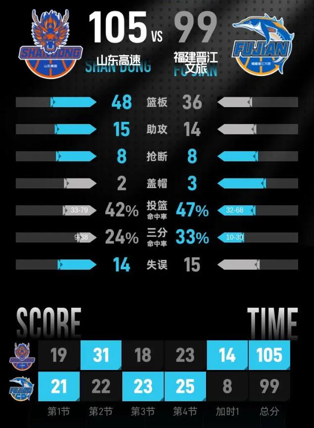 在第一个加时赛中,福建晋江文旅与山东高速的较量进入白热化阶段,双方均表现出极大的韧性,比分交替上升,始终难以分出高下。经过一番激烈的拼搏,山东高速最终以105-99赢得比赛,锁定胜局。