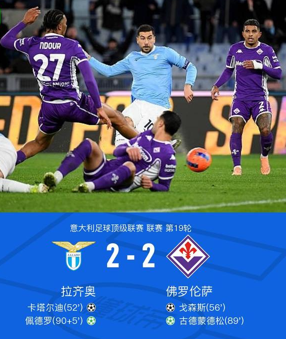 北京时间1月8日意大利足球顶级联赛 联赛 第19轮,拉齐奥主场对阵佛罗伦萨。上半场,双方战平。下半场,卡塔尔迪率先破门。随后,戈森斯将比分扳平。比赛尾声,古德蒙德松造点,亲自操刀主罚命中。补时阶段,扎卡尼造点,佩德罗一蹴而就绝平。最终,拉齐奥 2-2 佛罗伦萨。