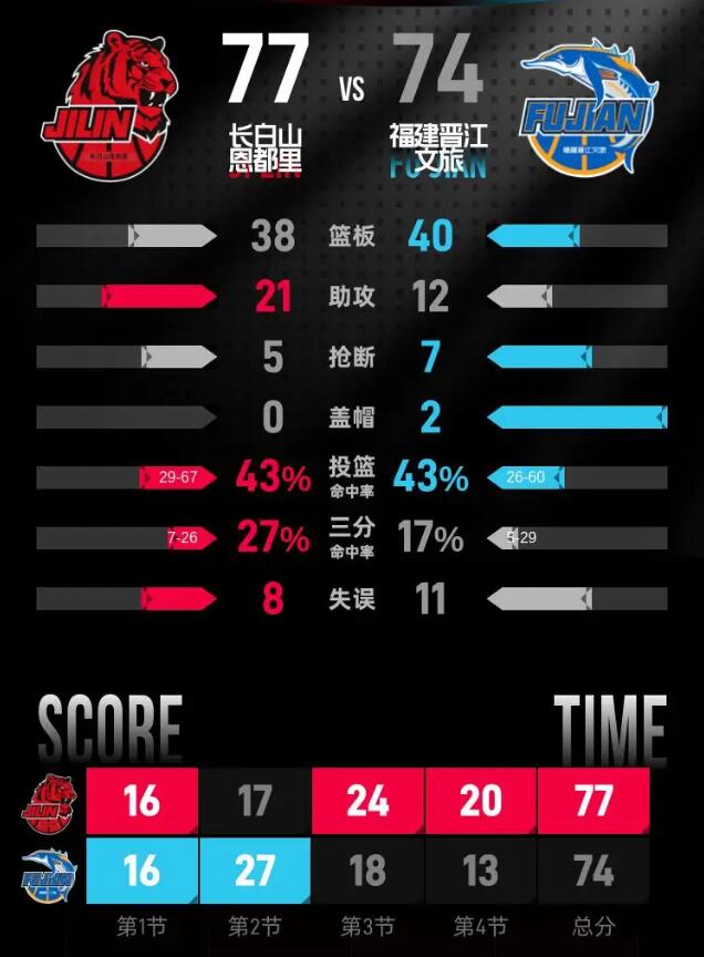 福建晋江文旅队:邹阳16分13篮板1助攻、特拉维斯·特莱斯14分1篮板3助攻、以赛亚·布里斯科13分2篮板4助攻、杨曦皓10分5篮板1助攻、德文·威廉姆斯9分2篮板1助攻、冯洺臻7分5篮板、黎伊扬3分3篮板1助攻、曾凌铉2分1助攻、弗拉迪米尔·布罗兹安斯基4篮板、杨阿力1篮板。