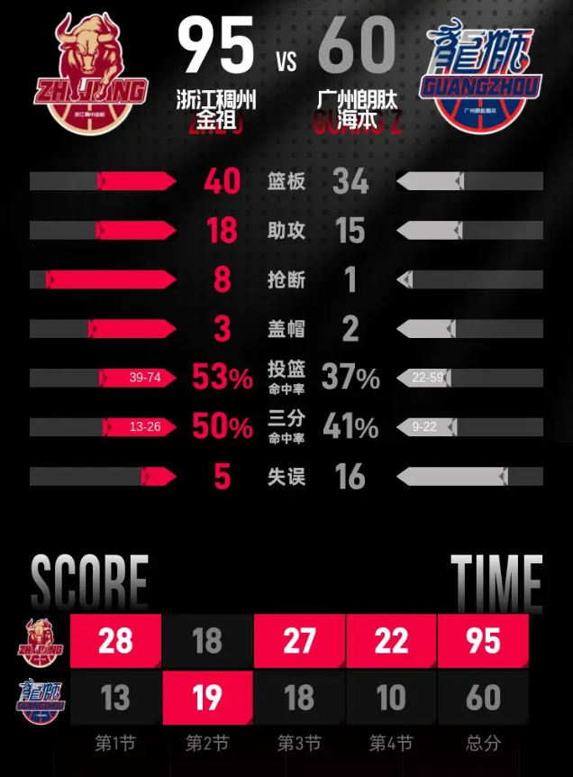 第四节,浙江稠州金租在开局阶段展开进攻,迅速将领先优势扩大至35分。尽管广州朗肽海本表现出一定的反弹,试图缩小差距,但已经无济于事。整场比赛结束时,浙江稠州金租以95-60获得胜利。