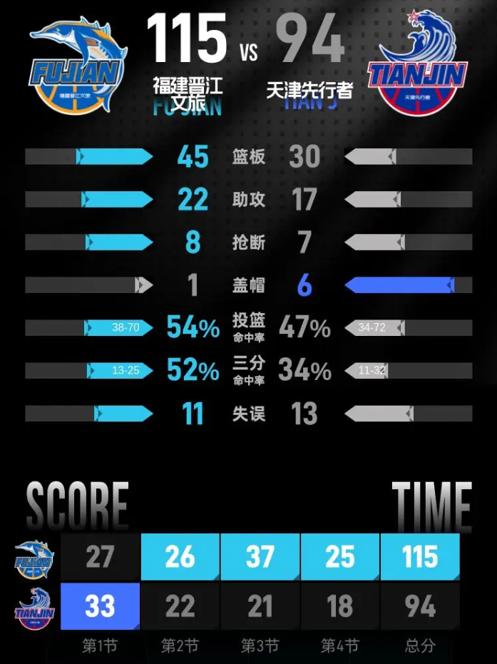 进入第四节比赛,福建率先一波9-0攻势扩大23分优势,天津一度请求暂停。天津打出一波11-2攻势追到差14分,福建连得5分扩大19分优势,天津再追5分。福建继续攻防压制扩大20+优势,比赛已经提前失去胜负悬念,最终福建大胜天津结束3连败。