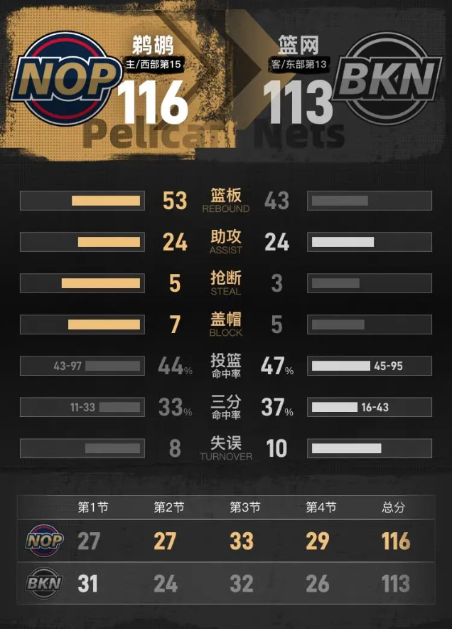 进入最后一节,鹈鹕开局遭遇困境,分差一度扩大至8分。然而,随着比赛的推进,鹈鹕逐渐找回状态,不仅追平比分还反超4分。尽管篮网在后段努力缩小分差,鹈鹕依靠墨菲三世的13分,其中包括一记外线三分,最终以116-113赢得比赛。