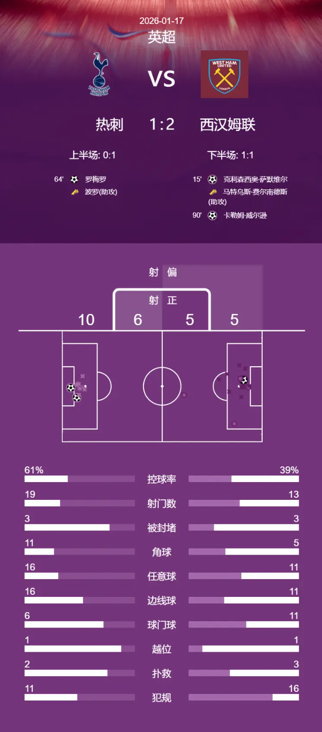北京时间2026年1月17日23:00,英超25/26赛季第22轮,热刺主场迎战西汉姆联。上半场,萨默维尔接费尔南德斯助攻为西汉姆联首开纪录。下半场,罗梅罗头球扳平比分,但补时阶段威尔逊绝杀比赛。最终,西汉姆联客场2-1战胜热刺,后者近7轮联赛仅拿到1场胜利。