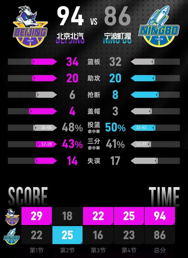 第四节,比赛进入最后的决战阶段,双方依然保持紧咬。宁波町渥的富兰克林·杰克逊在此节发力,独得11分并命中3记三分,试图为球队逆转争取机会。然而,北京北汽凭借整体的默契配合和顽强防守,最终以94-86赢得了比赛胜利。