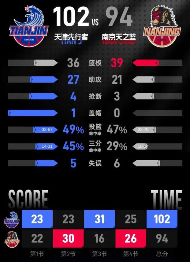 第四节,天津先行者延续良好的状态,在开局阶段迅速将优势扩大至11分。南京天之蓝不甘示弱,开始发起反击,将分差缩小至2分。最终,经过激烈的角逐,天津先行者稳住进攻节奏,保持优势,以102-94赢得比赛。