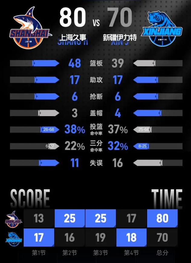 第四节,比赛伊始,上海久事依然未能得到理想表现,双方分差再次缩小至9分。随着时间的推进,上海久事开始发力,再次打出一波进攻,将分差扩大至18分。尽管新疆伊力特在比赛末段不断追赶,但最终未能逆转局势。随着终场哨声响起,上海久事以80-70赢下本场比赛。