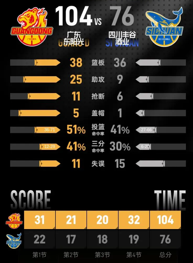 第四节,四川丰谷酒业并未放弃,努力将分差缩至59-72。但广东东阳光紧接着展开猛烈进攻,领先优势瞬间扩大至31分。末段,四川丰谷酒业再次反弹,试图追赶。广东东阳光的胡明轩在小节中表现出色,砍下10分,其中包括2记三分球。最终,广东东阳光以104-76赢得比赛。