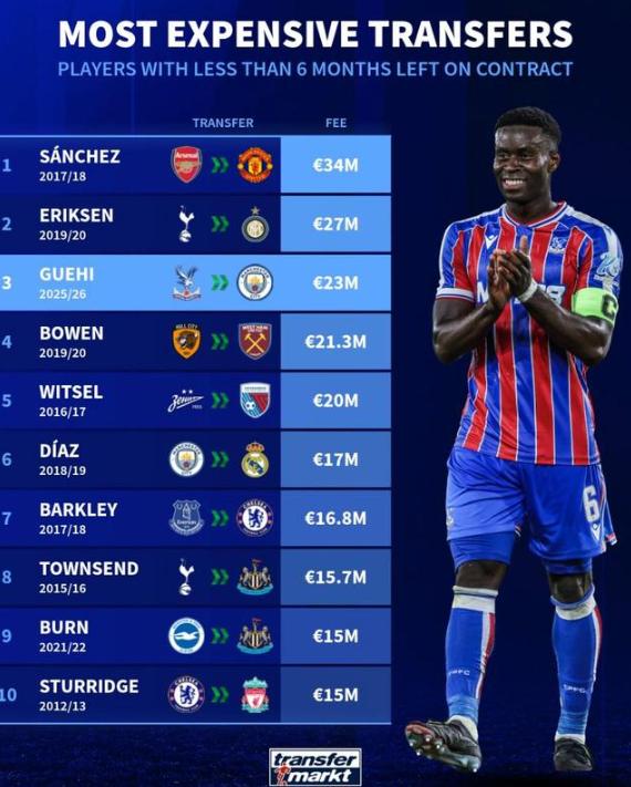 3. 格伊 25-26赛季 水晶宫>>曼城 2300万欧元