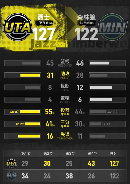 第四节伊始,爵士逐渐找回状态,通过连续得分将比分追平并反超8分。随着时间推移,森林狼在节末表现改善,开始缩小分差。最终,爵士的科利尔在本节中砍下12分,帮助球队以127-122赢得比赛。