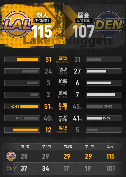全场具体比分(掘金队在后):28-37、29-34、29-17、29-19。