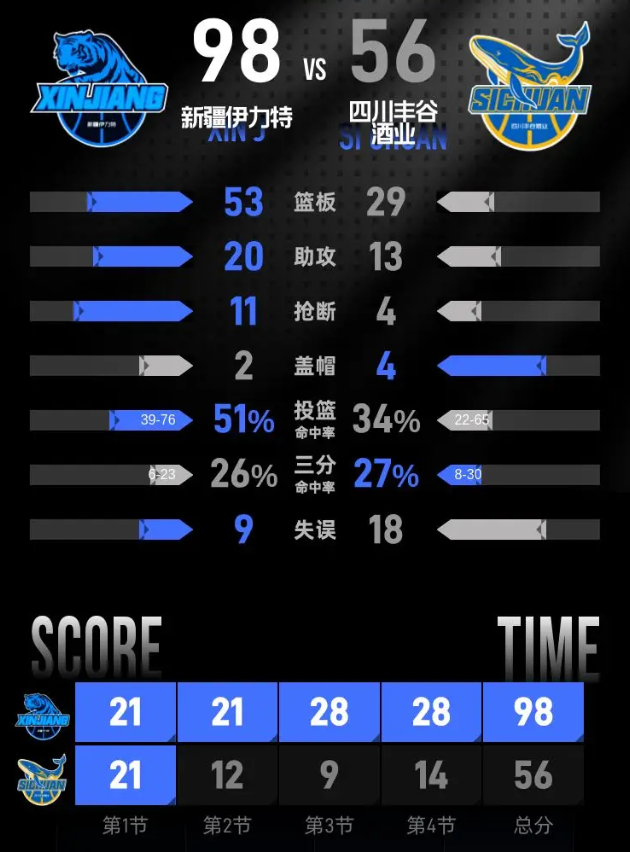 第四节,新疆伊力特延续了强劲的进攻势头,再次拉开到44分的领先优势。虽然四川丰谷酒业在小节中拼尽全力试图缩小差距,但随着比赛的临近尾声,新疆伊力特依旧保持领先。在这一节中,凯文·哈里斯表现突出,贡献11分,其中包括一记三分。最终新疆伊力特以98-56的比分赢得比赛胜利。