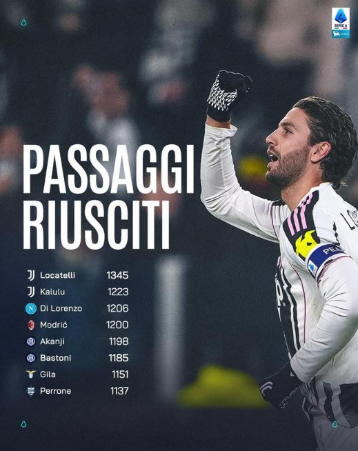本赛季至今意甲成功传球榜:洛卡特利第1,莫德里奇第4