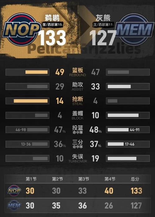 第四节开始,灰熊的状态依然低迷,鹈鹕则手感火热,很快将比分追平并超出,领先达到8分。随着时间推移,灰熊努力追赶,将差距缩小。本节比赛中,灰熊的斯宾塞表现亮眼,拿下12分,并投中两记三分球;而鹈鹕的贝则在这一节中取得了19分,包括三记三分。最终,鹈鹕以133-127赢得比赛。