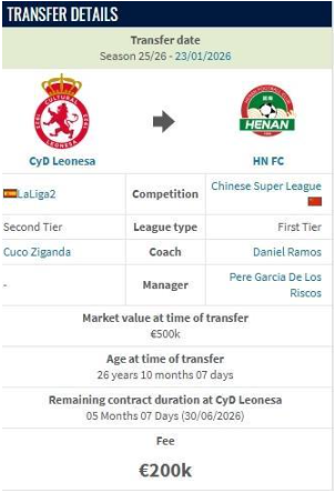 德转显示,西乙莱昂文体边锋姆布拉加盟河南队的转会费为20万欧。