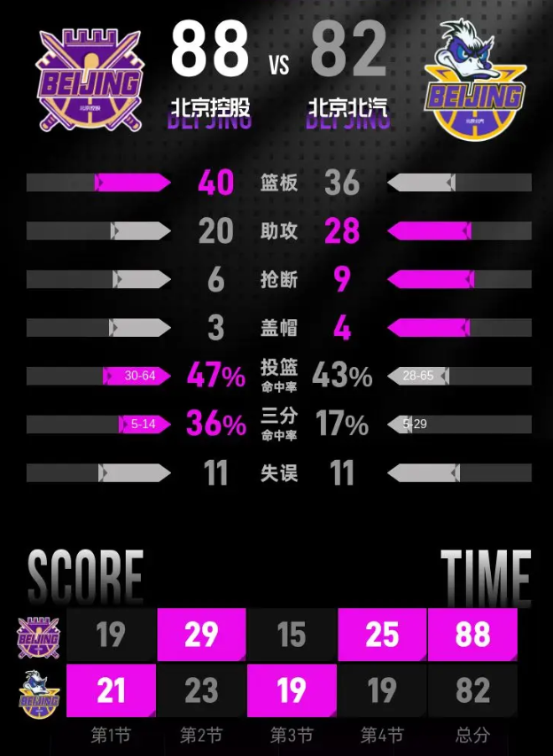 第四节,北京北汽先声夺人,开局打出一波攻势,将比分反超至67-64。不过,北京控股并未就此放弃,迅速找回状态,不仅抹平了分差,还在小节中段时将领先优势扩大到10分。尽管北京北汽奋起直追,努力缩小分差,但最终未能改写结果。比赛结束,北京控股以88-82赢得胜利。