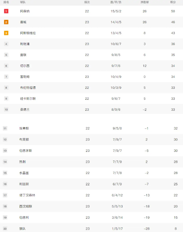 英超积分榜 曼城重返胜利 曼联若成功阻击阿森纳进前4
