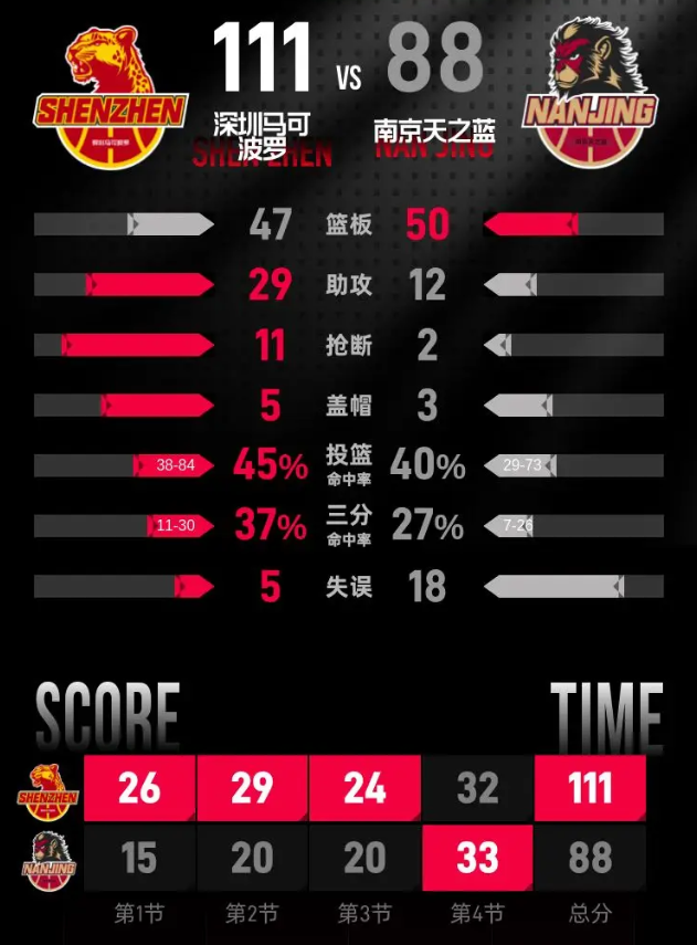 第四节,深圳马可波罗继续保持强势,牢牢占据比赛的优势地位。南京天之蓝无力回天,难以扭转局势。在本节中,深圳马可波罗的武子涵表现出色,贡献了10分,其中两记三分球尤为精彩。最终,在比赛结束时,深圳马可波罗以111-88赢得了比赛的胜利。