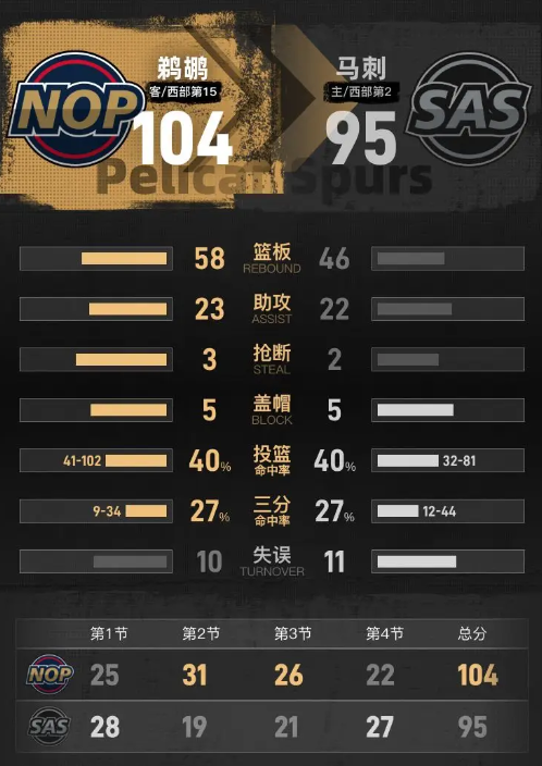 进入最后一节,马刺逐渐找到状态,迅速追赶比分,并在末段完成反超,以5分的优势暂时领先。面对窘境,鹈鹕及时调整,最终在比赛结束时将分差缩小并稳住局面,以104-95赢得比赛。