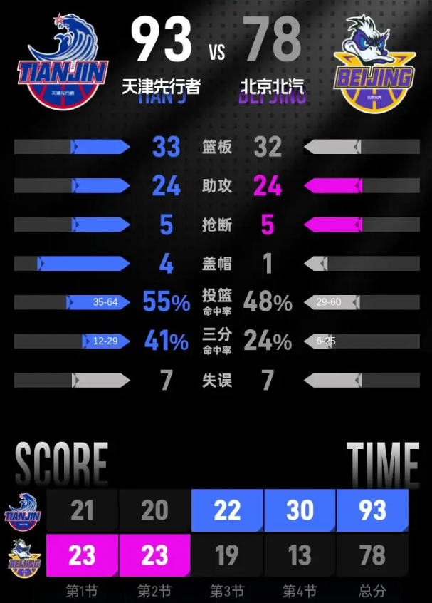 首节:比赛开局,双方球员手感不佳,接连打铁。詹姆斯上篮命中,为天津队拿下首球。张才仁压哨命中三分,马帝昂连得4分,赖俊豪两罚全中,林庭谦上篮回敬。张才仁再中三分,陈盈骏抢断后助攻杰曼上篮得分,赖俊豪三分回敬。翟晓川两罚一中,天津队连得4分追平比分至13-13。马帝昂补篮,斯佩尔曼暴扣,天津队一波6 - 0攻势反超2分。赵睿替补登场,贝利连得3分,斯佩尔曼三分命中,雷诺兹内线得分。首节结束,北京队23-21领先天津队。首节北京队15中9,三分5中3;天津队14中8,三分6中2,双方均无球员得分上双。