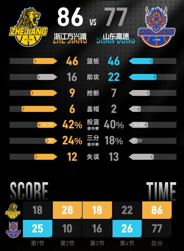 第四节,山东高速展开了反击,努力将分差缩小至3分,展现出顽强的斗志。然而,在比赛的后段,浙江方兴渡保持了良好的进攻节奏,稳步扩大领先优势,最终以86-77战胜山东高速,赢得了比赛的胜利。