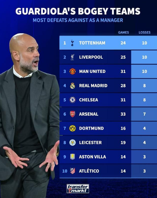 24战10负,热刺是瓜迪奥拉教练生涯输球场次最多的对手