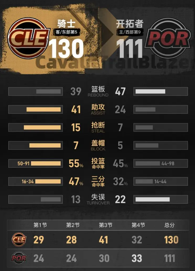 第四节开始后,开拓者陷入困难,分差一度达到24分。尽管期间尝试反击,曾将分差缩小至10分,但骑士始终保持着明显的优势,控制比赛节奏。在小节末段,骑士的进攻依旧流畅。此节中,开拓者的格兰特拿下10分,包括1记三分球。最终,骑士以130-111取得胜利。
