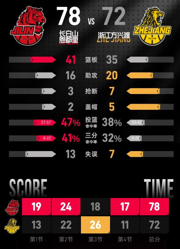 长白山恩都里队:德万特·威尔逊30分13篮板2助攻、姜伟泽19分6篮板2助攻、曾繁日12分9篮板5助攻、栾利程9分2篮板1助攻、达拉斯·摩尔6分2篮板6助攻、段立谦2分1篮板、贾昊4篮板。