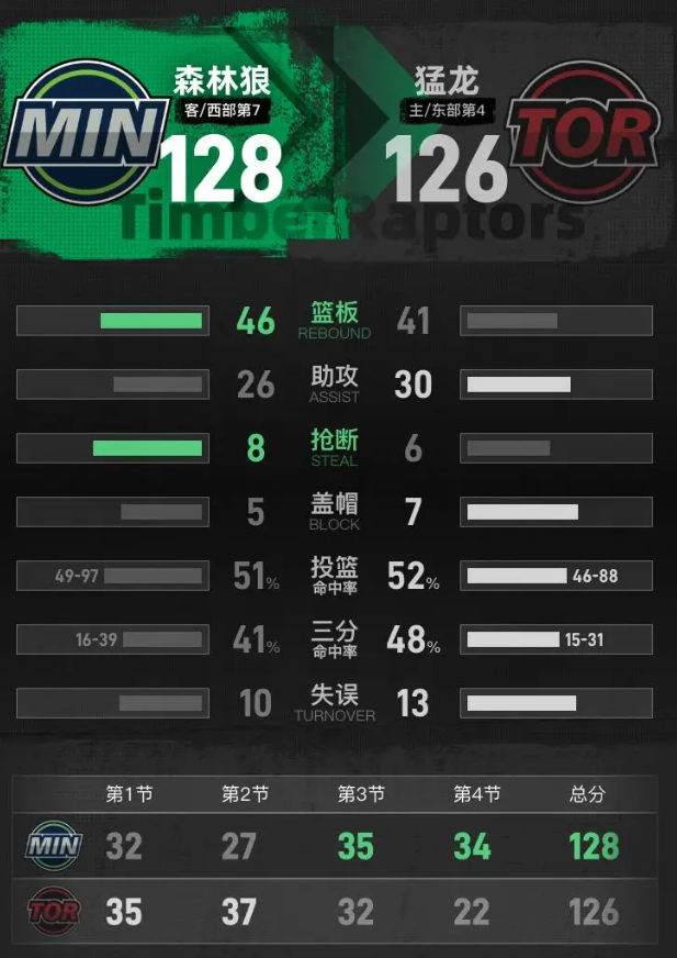 第四节,猛龙在开局打出一波进攻,迅速将比分拉至106-94。然而,森林狼不甘示弱,努力反击,不仅抹平了比分,还反超领先5分。此时,猛龙逐渐缩小分差,但未能逆转比赛。最终,森林狼以128-126赢下比赛。