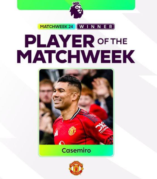 英超官方公布第24轮周最佳球员,曼联中场卡塞米罗当选。至此,英超第21至24轮周最佳已全部被曼联球员包揽。