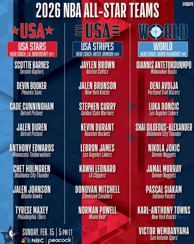 北京时间2月4日,2026年NBA全明星赛阵容分队正式揭晓,美国明星队、美国条纹队与世界队将展开循环赛制的小型锦标赛,进行四场12分钟的比赛。