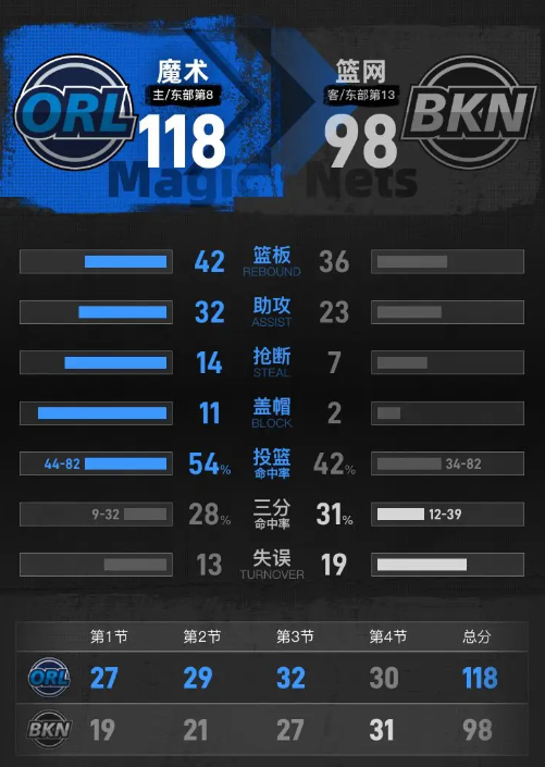 在最后一节比赛开始时,魔术再度遭遇手感不佳,分差缩小至17分。随着比赛的推进,他们逐步恢复状态,打出一波强劲的进攻,将领先优势重新扩大到26分。虽然篮网尝试收复失地,但仍未能缩小比分差距。最终,魔术以118-98赢得了比赛。