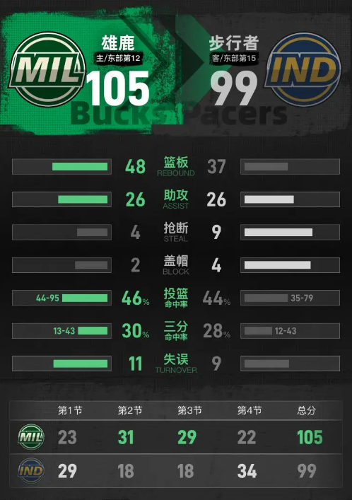 第四节,雄鹿延续良好状态,开局立刻发起进攻,将优势扩大至23分。中段,步行者奋力反击,将分差缩小至7分。尽管如此,雄鹿并未放松,持续保持高效的进攻节奏,稳步扩大自己的领先优势。值得一提的是,步行者的内姆布哈德在本节表现亮眼,砍下18分并贡献了3记三分球。最终,第四节比赛结束,雄鹿以105-96赢得比赛。