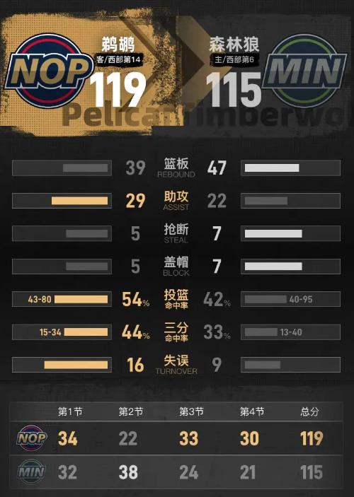 全场具体比分(森林狼队在后):34-32、22-38、33-24、30-21。