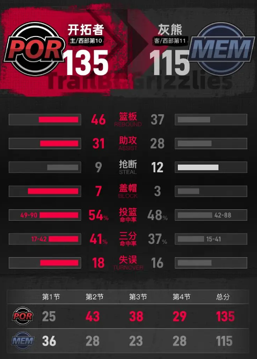 第四节,开拓者在开局阶段状态火热,再次打出一波30分的优势。随着比赛进入末段,灰熊紧追不舍,但开拓者始终保持着领先。吕佩尔在本节中表现抢眼,独得12分,其中包括4记三分球。最终,开拓者以135-115赢下比赛。