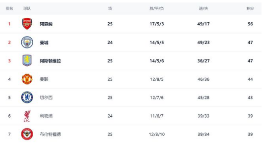 在积分榜上,阿森纳以56分排名榜首。曼城少赛一轮,依然是47分,排名第2。阿斯顿维拉只拿到一场平局,总积分也是47分,排名第3。阿森纳的领先优势足足有9分,让冠军悬念越来越小。曼联不断赢球,总积分已经达到44分,排名第4。切尔西以43分排名第5。利物浦39分排名第6。