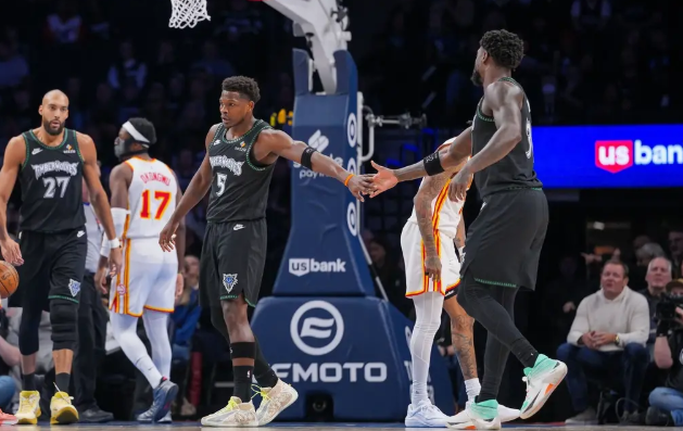 森林狼队首发:安东尼-爱德华兹、朱利叶斯-兰德尔、鲁迪-戈贝尔、贾登-麦克丹尼尔斯、丹特-迪文琴佐