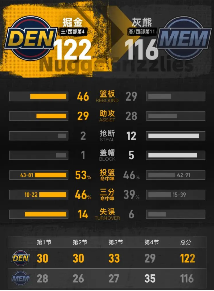 第四节,双方在场上展开激烈的对抗,战况相当胶着。尽管灰熊多次尝试反击,但掘金始终保持微弱的领先优势,最终以122-116赢下比赛,锁定胜局。