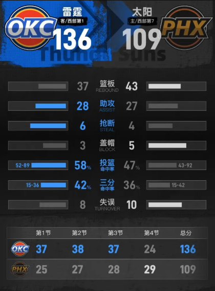 第四节开始,太阳的表现相较之前显得愈发乏力,比分一度落后34分。虽然节中尝试反击将分差缩小至23分,然而雷霆的进攻仍然火力全开进入末段,保持了明显的领先优势。最终,第四节结束,雷霆以136-109赢下比赛。