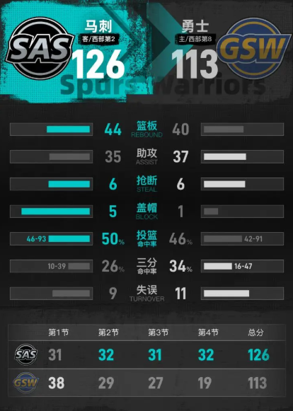 第四节,马刺在小节开始后迅速展开攻势,迅速将分差扩大到13分。然而,勇士在比赛后段发起反击,努力缩小分差。尽管拼尽全力,勇士未能逆转局势。最终,马刺以126-113赢得比赛。