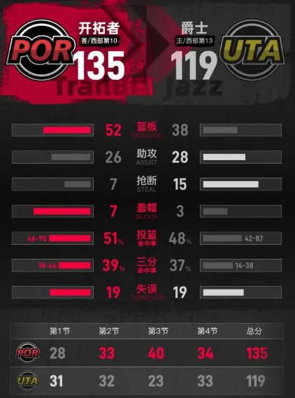第四节开局,爵士努力缩小劣势,迅速将比分追至108-111。但开拓者进行了一波强力进攻,将分差拉大至19分。尽管爵士在小节后段重新调整,逐步将比分拉近,但最终未能逆转局势。爵士的米哈伊柳克在本节表现出色,砍下14分,并命中4记三分。但比赛结束时,开拓者以135-119战胜爵士,收获胜利。