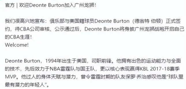 广州男篮作为CBA第一阶段大黑马球队之一,在没有大手笔引援的情况下,取得了10胜12负的成绩,在少赛一轮的情况下,目前暂列联赛第十三名,整体表现远超俱乐部预期。这个休赛期,广州男篮又在积极调整外援阵容,俱乐部官宣裁掉了锋线外援托马斯,签下NBA级后卫德翁特-伯顿。托马斯第一阶段的表现很不理想,场均出战18.4分钟贡献8.5分5篮板2.4助攻,投篮命中率44.7%,三分命中率只有27.5%,攻防两端的表现远低于俱乐部的预期,被裁掉也在意料之中。为了提升球队整体进攻实力,广州男篮还是签下了此前代表球队参加过NBA夏季联赛的德翁特-伯顿,后者待CBA公司审核、公示通过后,将身披广州龙狮战袍开启自己的CBA生涯!
