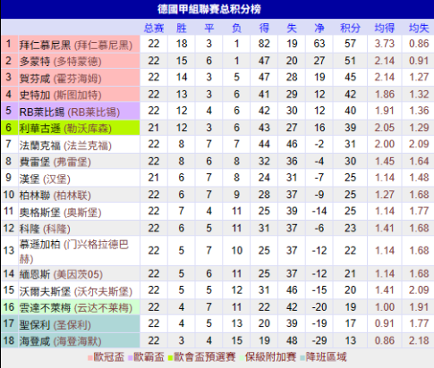 而拜仁目前以6分优势领跑,多特蒙德是拜仁争冠最大劲敌,此外斯图加特队处于争四的有利位置,不过暂时仅领先第5的莱比锡队2分,可以看到争四非常激烈,多支球队争夺第4的位置。这也是本赛季德甲的一大看点。