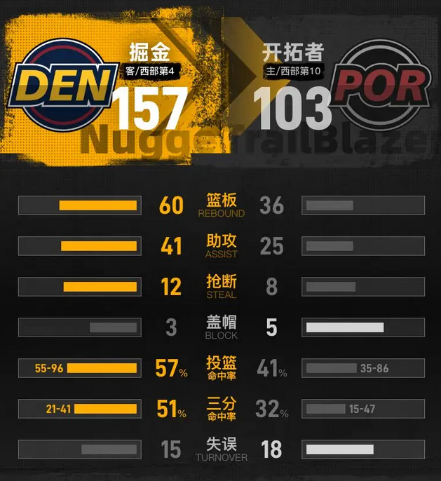 第四节,开拓者从开局时就积极尝试缩小分差,比分一度追至89-125。但随后掘金再次发起攻击,将领先优势扩大至55分。小节后段,开拓者又一次发力,努力拉近比分。最终,掘金以157-103赢得比赛。