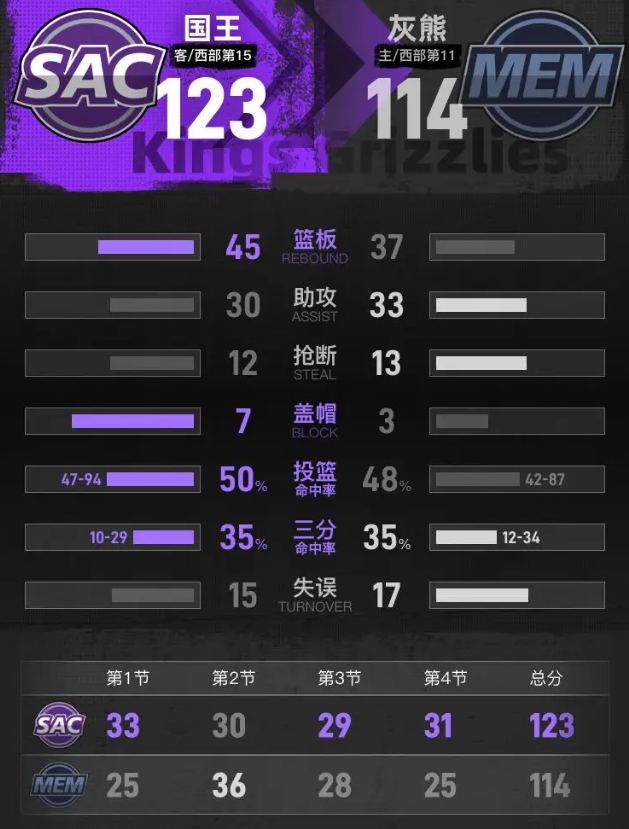 时间:2026-02-24 11:37:02北京时间2月24日NBA常规赛,客场作战的国王以123-114击败灰熊。阿丘瓦22分12篮板0助攻,斯莫尔21分6篮板9助攻。