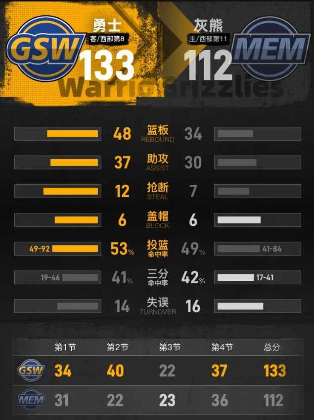 第四节比赛开始,勇士趁势展开猛烈攻势,将分差一度扩大到32分。尽管灰熊在小节后段回过神来重新缩小比分,杰罗姆凭借10分的出色发挥(包括2记三分)贡献力量,而勇士的佩顿二世同样得到10分(包括2记三分)。最终,勇士以133-112赢得比赛。