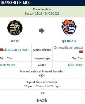 北京时间2月26日,德转更新,温州队门将买乌兰加盟青岛海牛,转会费约50万人民币。